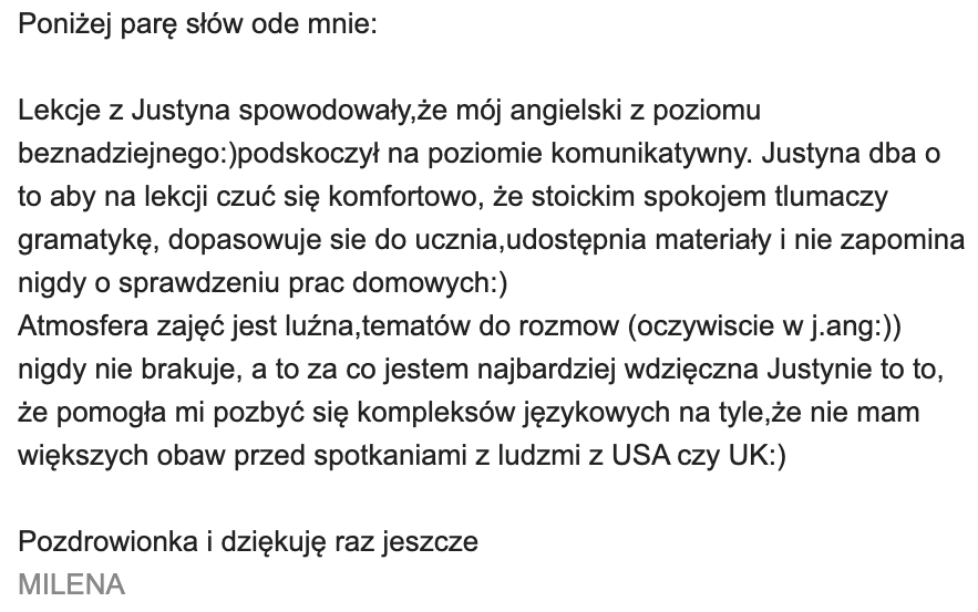 Historie kursantów mówią więcej niż jakikolwiek opis. To one najlepiej pokazują drogę od punktu startowego do swobody w mówieniu. Oto co nasi uczniowie mówią o naszych zajęciach: